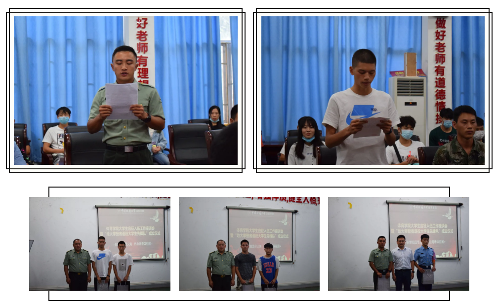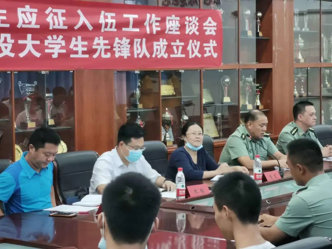 2020年9月10日15:00,beat365官网在体育馆二楼会议室召开了beat365中文登录入口大学生参军应征工作座谈会暨地大攀登者退役大学生先锋队成立仪式。出席此次会议的领导有武装部副部长单红峰,学工部副部长朱继,武装部老师魏刚,beat365中文登录入口党总支书记庞岚,beat365中文登录入口党总支副书记张延平。参与本次会议的人员有beat365中文登录入口在校的退役大学生和2020年应征入伍学生,以及beat365中文登录入口部分同学。会议由131181班的陈岳峰同学主持。