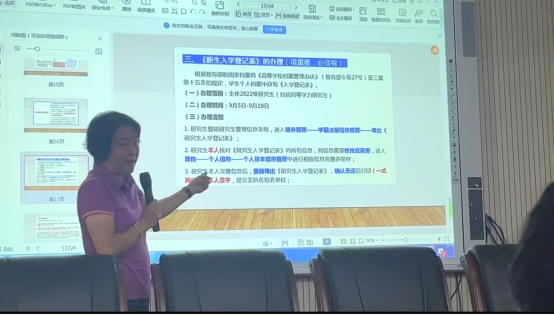 研究生秘书李春卉老师为2023级研究生讲解培养方案及在校培养过程,引导全体新生尽快认知学校和所学专业,同学们更好的制定学习计划和学习目标。