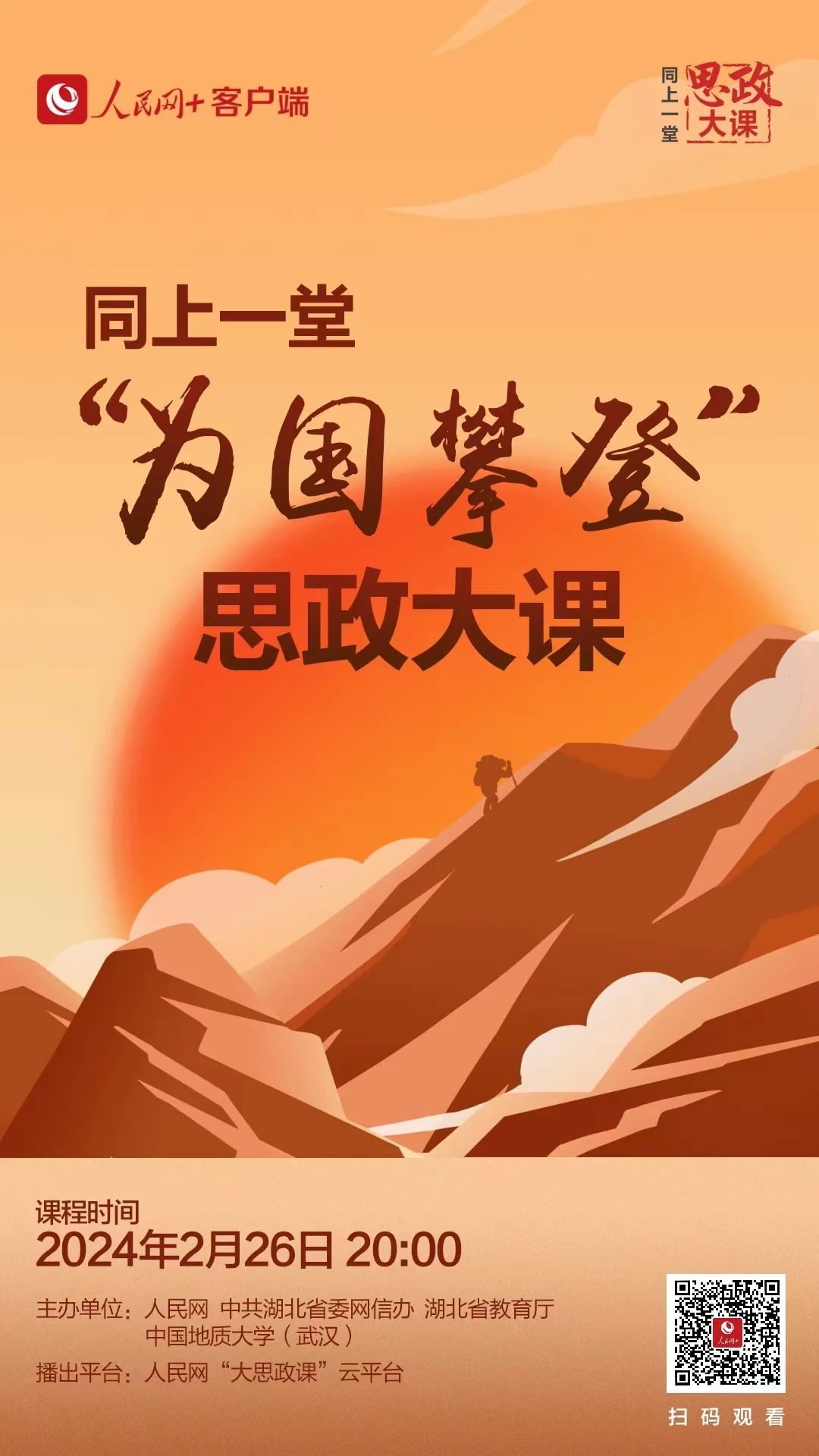 2月26日晚20:00,学院组织全院本研学生同上一堂“为国攀登”思政大课,听中国科学院院士中国地质大学(武汉)校长王焰新、地球科学学院教授宋海军、beat365中文登录入口90后青年教师何鹏飞讲述征服珠峰的感人故事,领悟“扎根中国、胸怀天下勇攀高峰、追求卓越”的攀登精神。