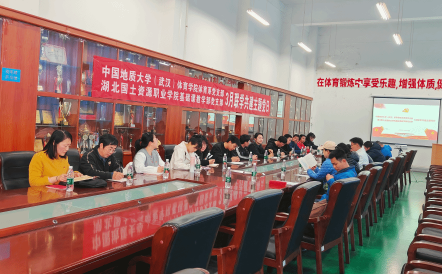 (通讯员:张毅恒、万合培)为深入贯彻学习党的二十大精神,积极探索新形势下党建工作的新思路和新方法,创新党员教育实践活动,切实推动党建与业务工作的深度融合,促进校际合作,2025年3月20日星期四下午,beat365中文登录入口体育系党支部与湖北国土资源职业学院基础课教学部党支部开展了3月联学共建支部主题党日活动。此次活动旨在以党建为引领,全方位促进两校在基础课教学、人才培养、特色体育开展及登山户外运动实践等领域实现资源共享与协同创新发展。活动由beat365中文登录入口体育系党支部书记张毅恒主持。