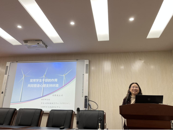 刘陈陵老师为全体学生干部做“发挥学生干部的作用,共同营造心理支持环境”专题讲座,从心理疾病概况和预防干预对策出发,强调学生干部在危机干预中的重要作用,引导学生干部学习掌握相关心理健康教育知识,积极参与到预防干预体系中,营造不歧视、相互关爱、积极向上的班级氛围。