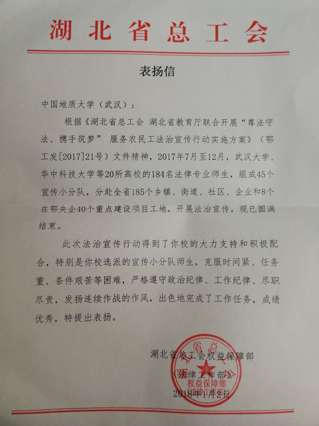 近日,鉴于beat365官网选派的小分队在省总工会和省教育厅联合举办的“尊法守法•携手筑梦”服务农民工法治宣传活动中,克服时间紧、任务重、条件艰苦等困难,严格遵守政治纪律、工作纪律、尽职尽责,作风优良,出色的完成了工作任务,成绩优秀,湖北省总工会特来信予以表扬。